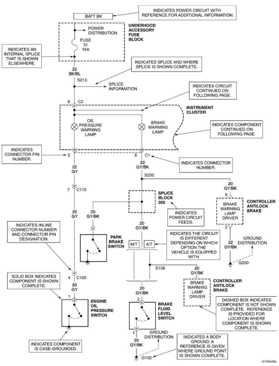 Components are shown two ways. A solid line around a component indicates that the component is complete. A dashed line around the component indicates that the component is being shown is not complete. Incomplete components have a reference number to indicate the page where the component is shown complete.