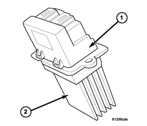 The blower motor power module is mounted to the bottom of the HVAC housing, on the passenger side of the vehicle. The blower motor power module consists of a molded plastic mounting plate with an integral connector receptacle (1). Concealed behind the mounting plate is the power module electronic circuitry and a large finned heat sink (2). The blower motor power module is accessed for service from under the instrument panel.