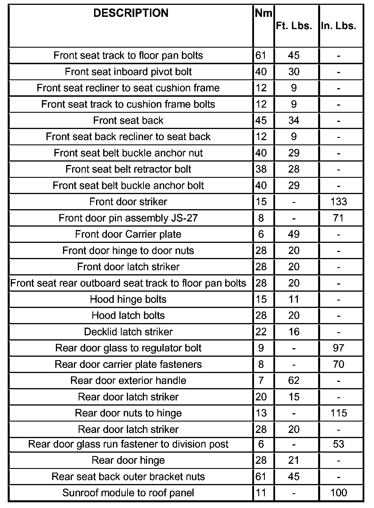 SPECIFICATIONS - TORQUE