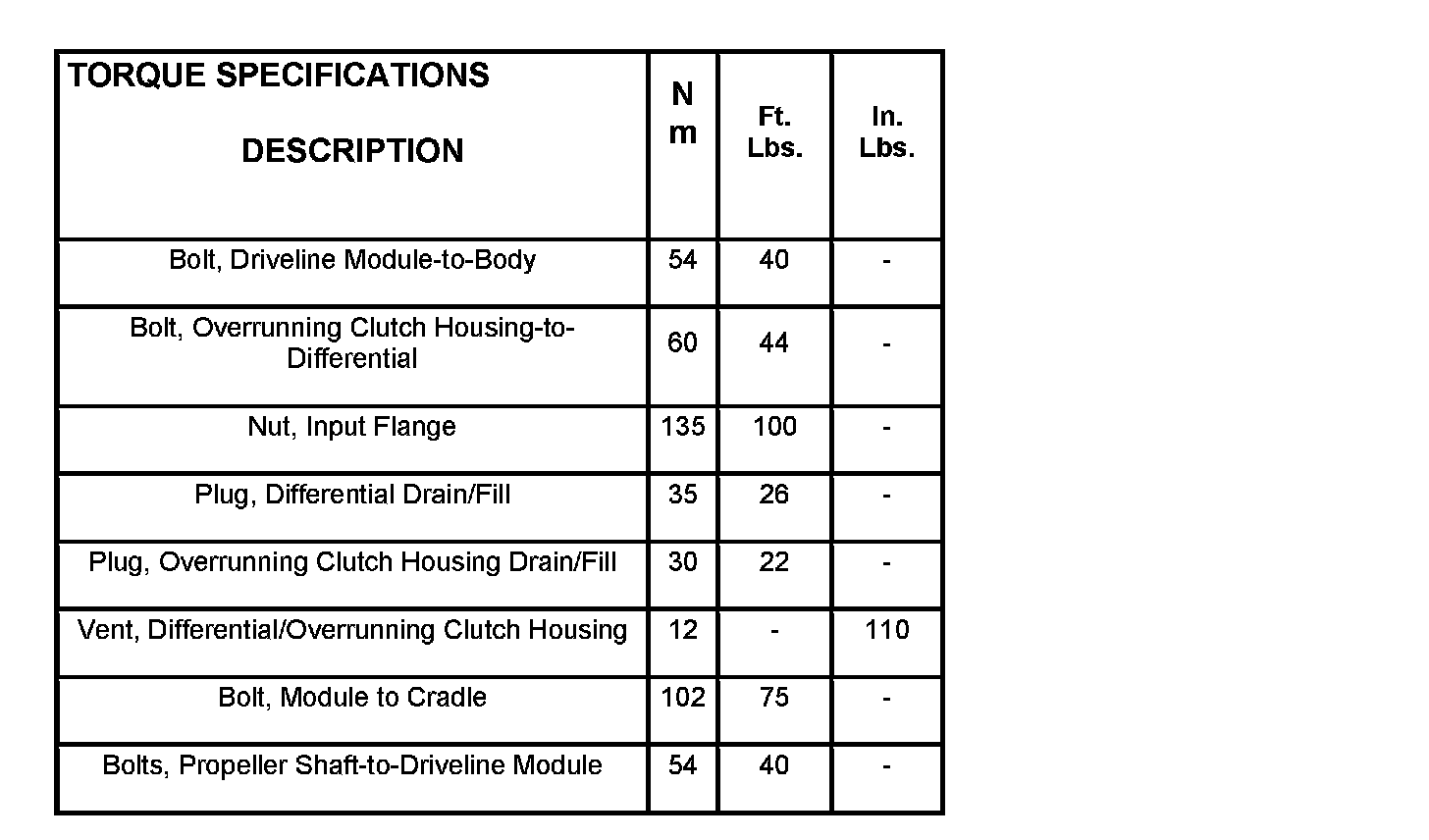 SPECIFICATIONS - REAR DRIVELINE MODULE
