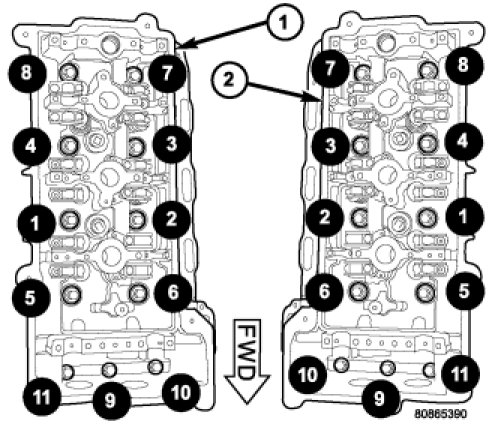 Tighten bolts in sequence shown for left head (2) and right head (1), using the following steps and torque values: