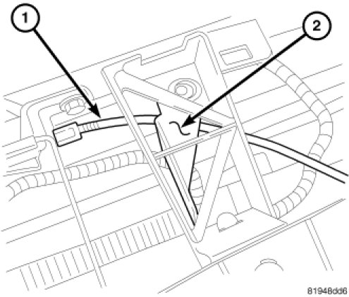 CAUTION: The hood release cable must be routed under the bracket assembly. Failure to route the hood release cable properly may pinch the cable and make the hood release inoperable This may cause damage to the release mechanism and/or cable.