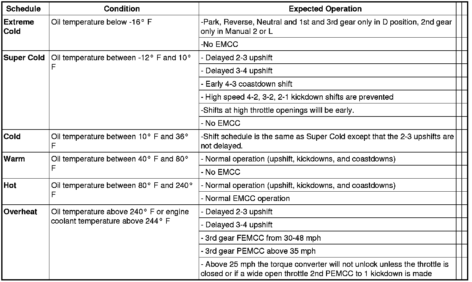 As driving conditions change, the TCM appropriately adjusts the shift schedule. Refer to the following chart to determine the appropriate operation expected, depending on driving conditions.