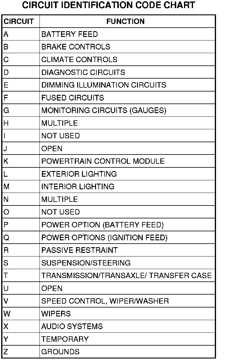 All circuits in the diagrams use an alpha/numeric code to identify the wire and it's function. To identify which circuit code applies to a system, refer to the Circuit Identification Code Chart. This chart shows the main circuits only and does not show the secondary codes that may apply to some models.