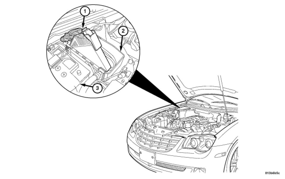 The Body Control Module (BCM) (1) is concealed in the engine compartment inside of the Control Module Box (2) located next to the battery (3).