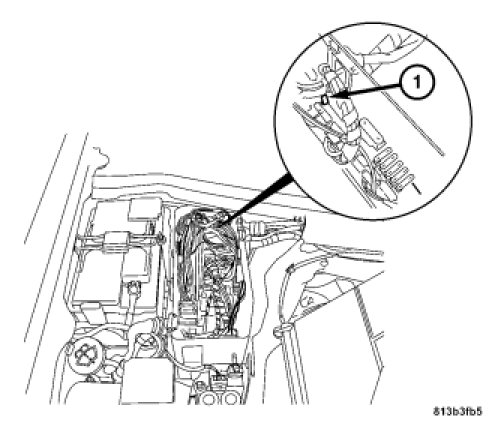 4. Disconnect the electrical connectors (1) by first sliding the grey windshield wiper connector lock to the right and removing the windshield wiper electrical connector. Then, pull the metal body control module connector lock up to unlock and disconnect the rest of the body control module electrical connectors.