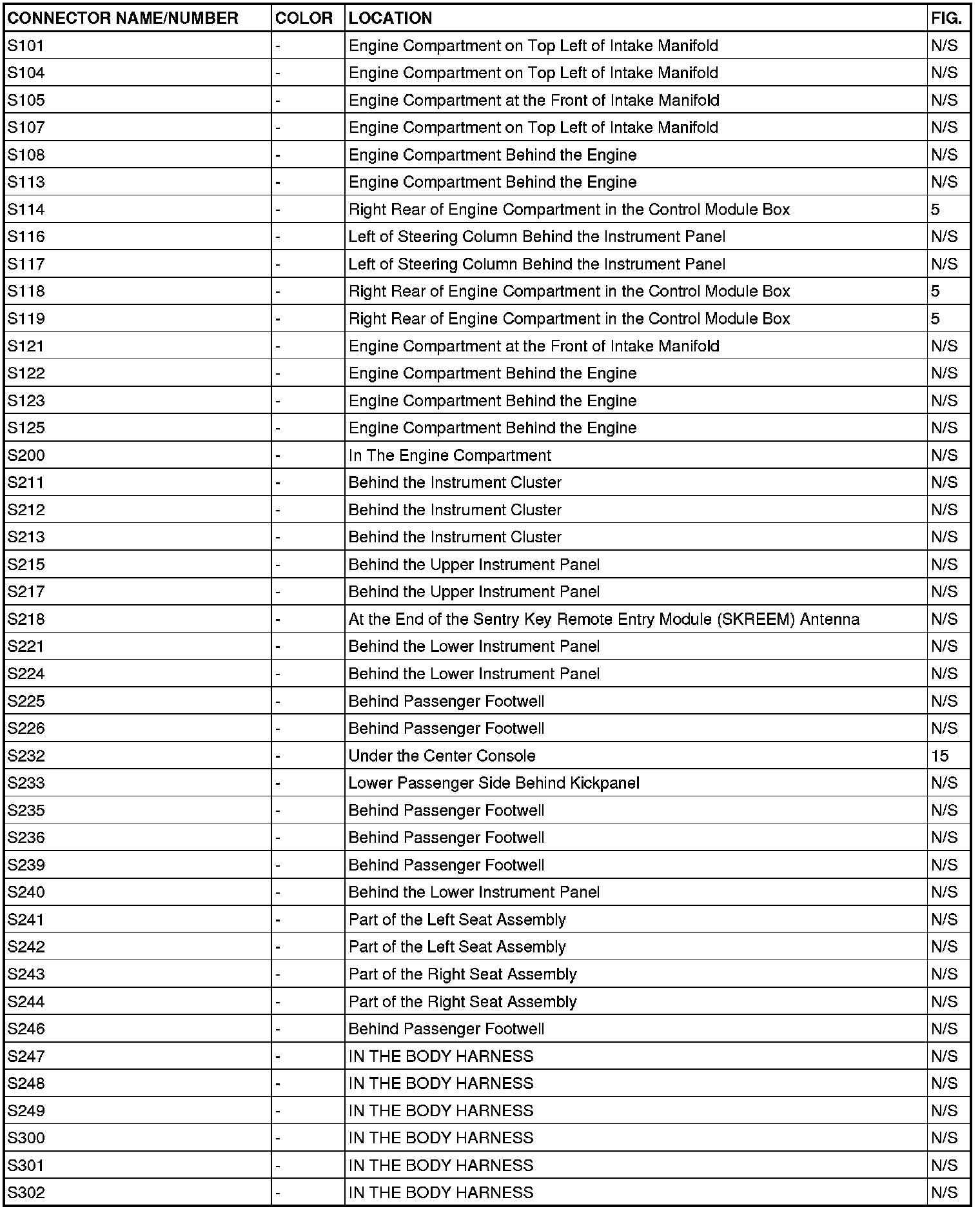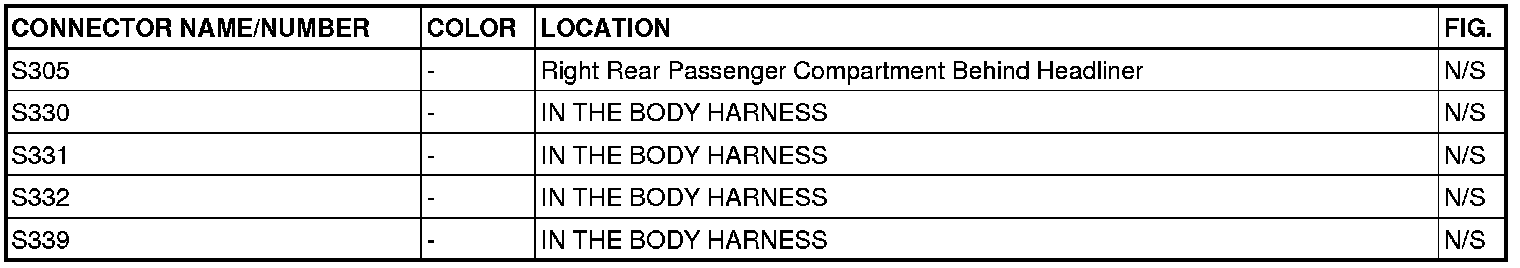 This section provides illustrations identifying connector, ground and splice locations in the vehicle. Connector, ground and splice indexes are provided. Use the wiring diagrams in each section for connector, ground and splice identification. Refer to the appropriate index for the proper figure number. For items that are not shown in this section N/S is placed in the Fig. column.