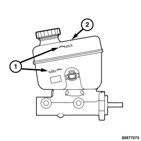 The reservoir (2) has a "MIN" and a "MAX" mark (1) on the side. Always fill to the "MAX" mark.