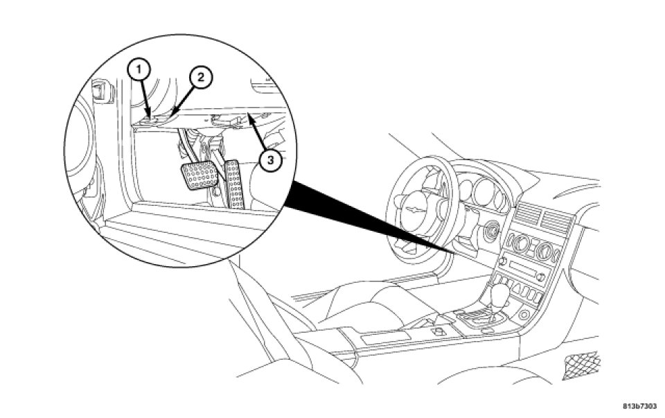 The Data Link Connector (DLC) (1) is located at the lower edge of the instrument panel (3) near the hood release (2). The exposed connector terminals are protected by a plastic cover which flips open if access is needed.