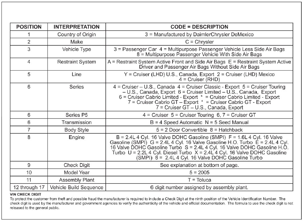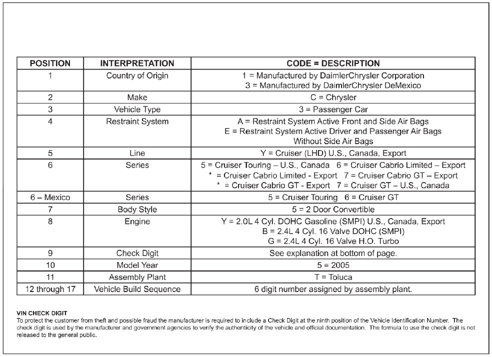 Home >> Chrysler >> 2008 >> PT Cruiser L4-2.4L >> Repair and Diagnosis >> Application and ID >> Vehicle Identification Number >> Convertible >> Vehicle Identification Number Decoding Chart