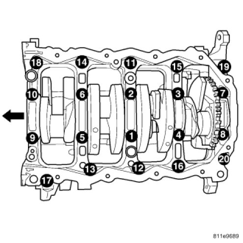 2. Install main bearing cap/bed plate to engine block bolts 11, 17, and 20 finger tight. Tighten these bolts down together until the bed plate contacts the cylinder block.