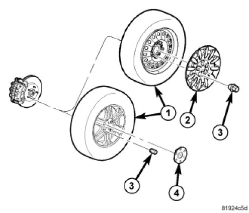 9. Install tire and wheel assembly (1) Tires and Wheels - Installation. Install and tighten wheel mounting nuts (3) to 135 Nm (100 ft. lbs.).