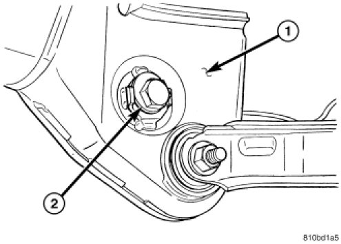 3. Rotate the cam bolt head (2) on the opposite side (front) of the crossmember (1) in either direction until the preferred specification is obtained. [1][2]Alignment