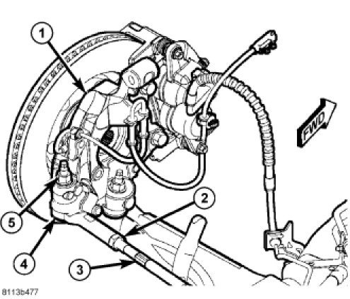 CAUTION: When removing the steering knuckle from the strut clevis bracket, do not put a strain on the brake flex hose. Also, do not let the weight of the steering knuckle assembly be supported by the brake flex hose when removed from the strut assembly. If necessary use a wire hanger to support the steering knuckle assembly or if required remove the brake flex hose from the caliper assembly.