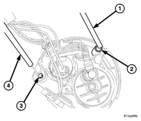 5. Install module top short rod (4) to the module bottom (3) and the module top long rod (1) to the module bottom (2) as shown for proper orientation of the module within the fuel tank. When the fuel pump module is installed inside the fuel tank the fuel level arm will be facing toward the rear of the fuel tank.