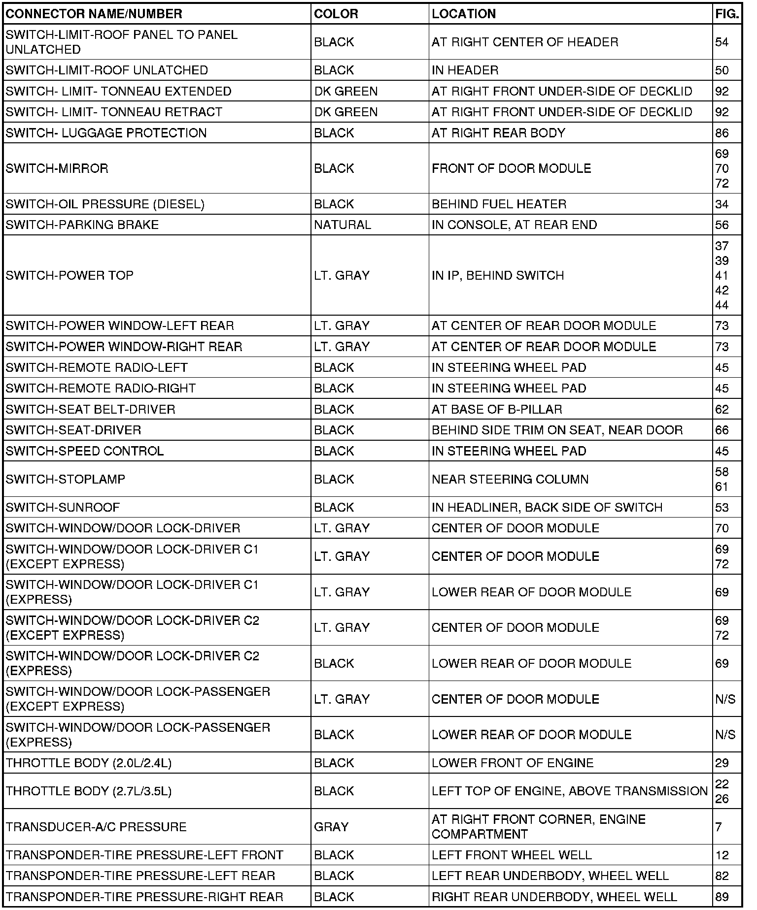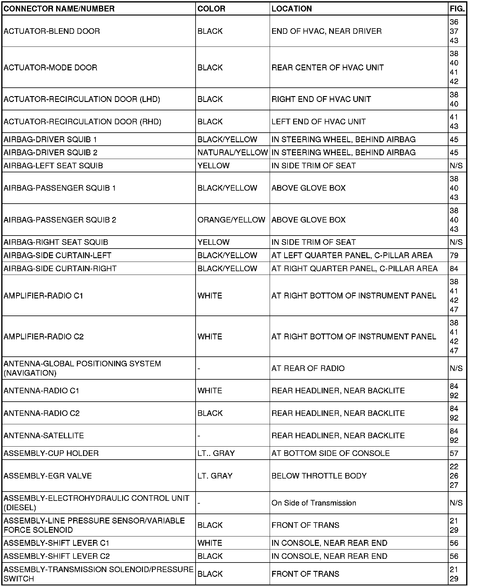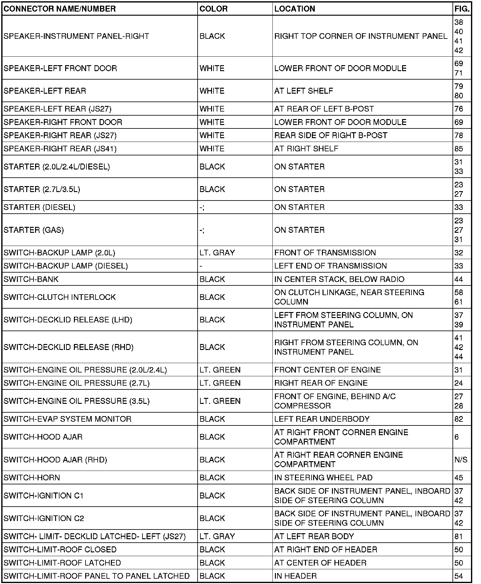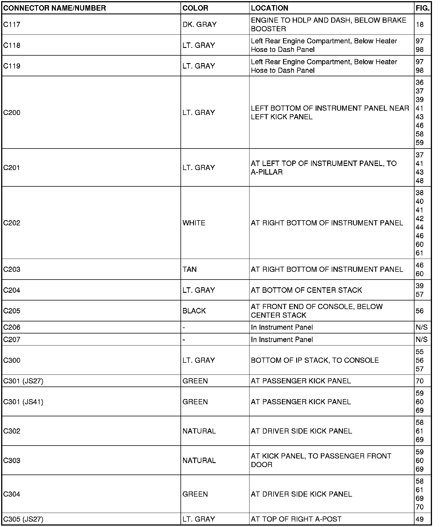 This section provides illustrations identifying connector, ground and splice locations in the vehicle. Connector, ground and splice indexes are provided. Use the wiring diagrams in each section for connector, ground and splice identification. Refer to the appropriate index for the proper figure number. For items that are not shown in this section N/S is placed in the Fig. column.