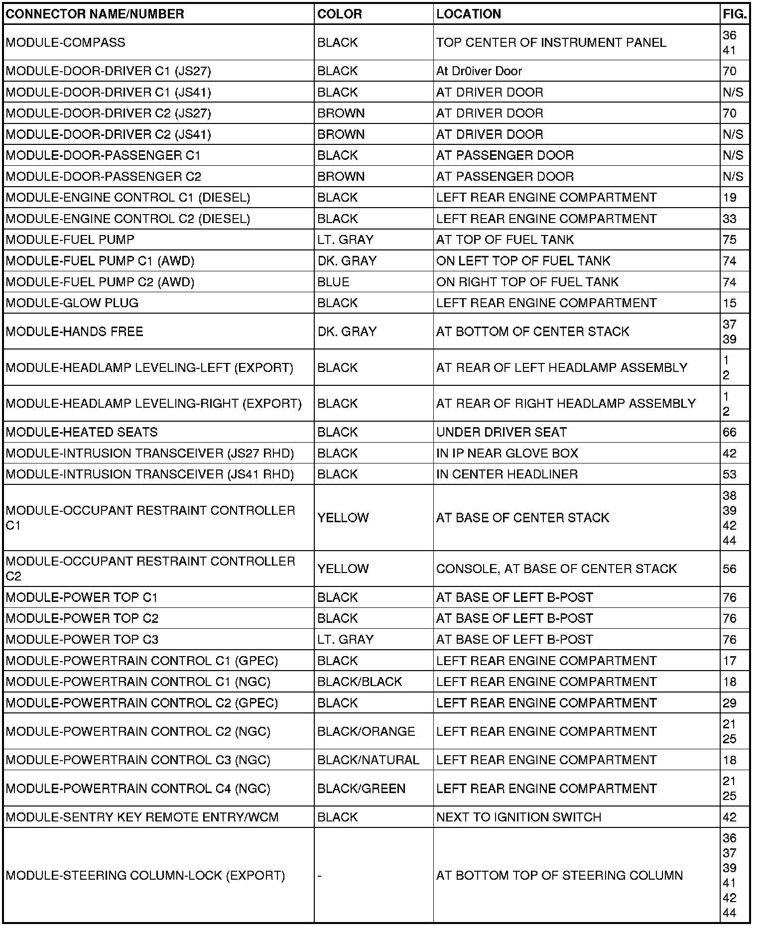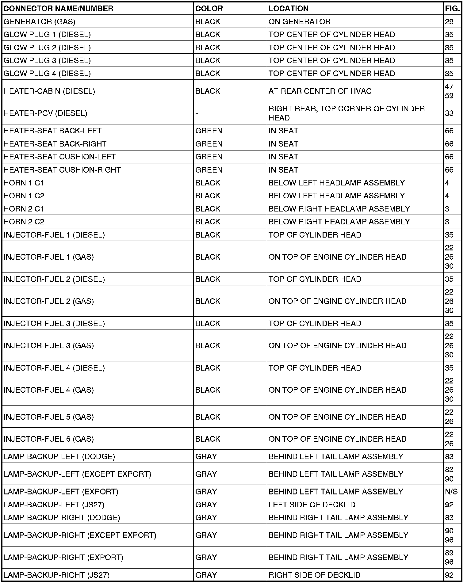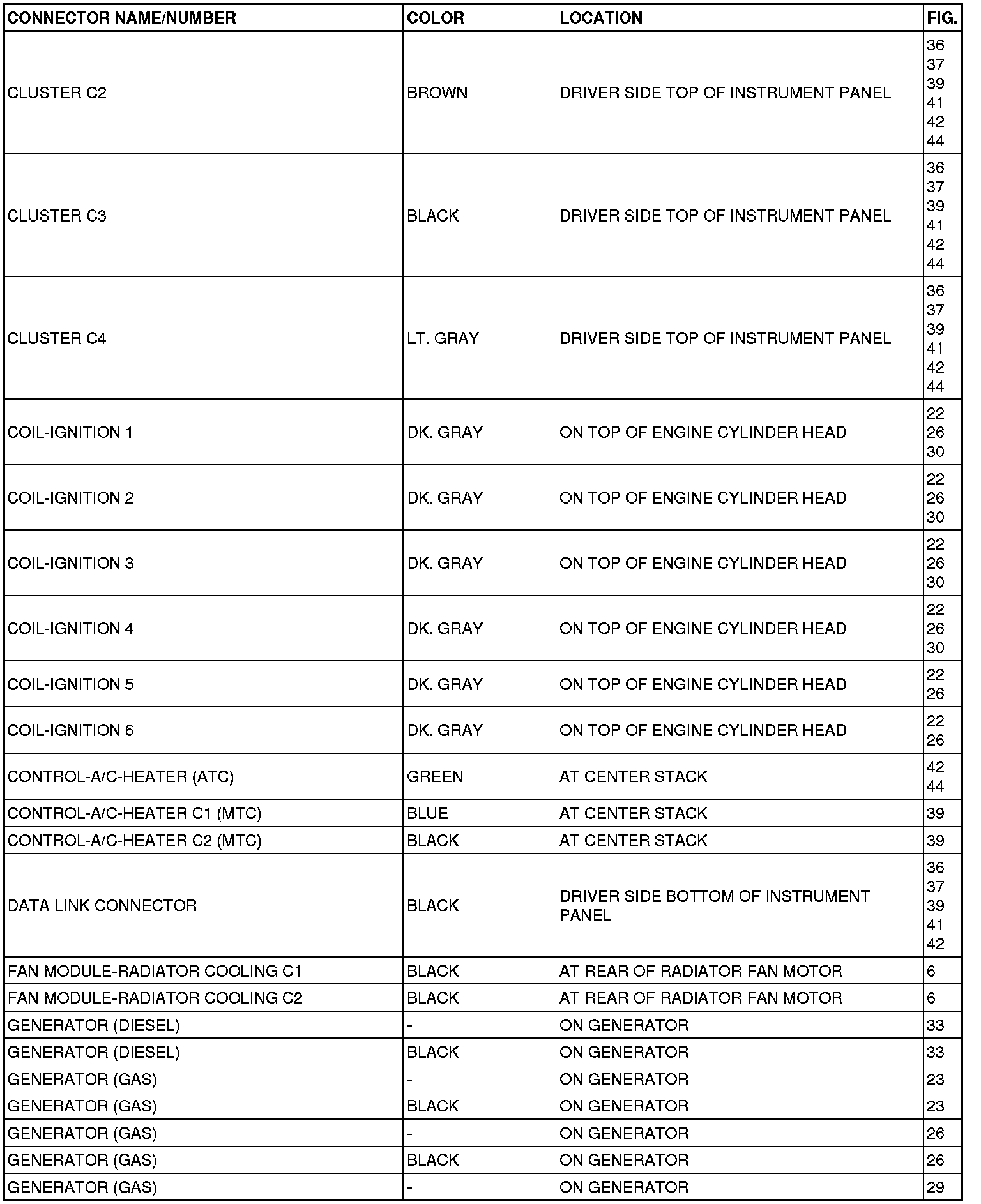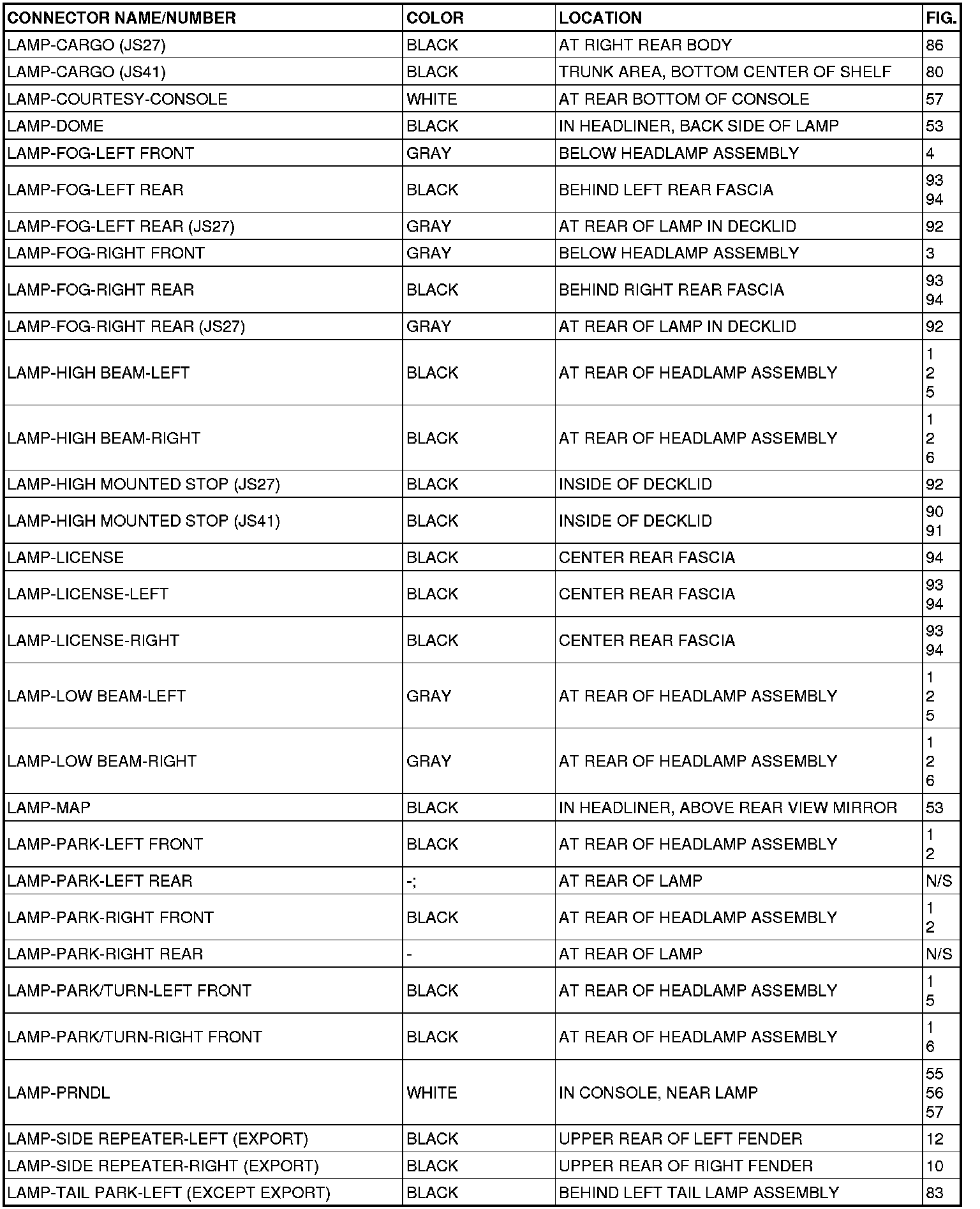 This section provides illustrations identifying connector, ground and splice locations in the vehicle. Connector, ground and splice indexes are provided. Use the wiring diagrams in each section for connector, ground and splice identification. Refer to the appropriate index for the proper figure number. For items that are not shown in this section N/S is placed in the Fig. column.