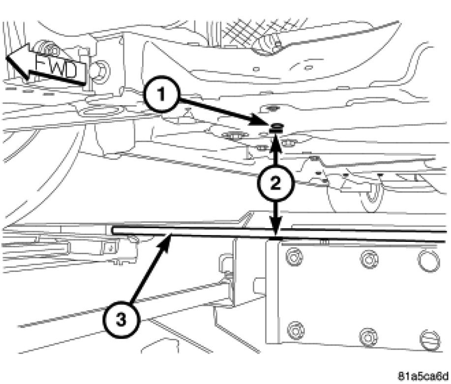 2. Front - On each side of the vehicle, measure the distance (2) from the flat surface behind the PLP hole (1) to the floor or alignment rack/lift runway surface. It may be necessary to measure to the bottom of a straight edge (3), placed from lift runway to runway, to get an accurate measurement.