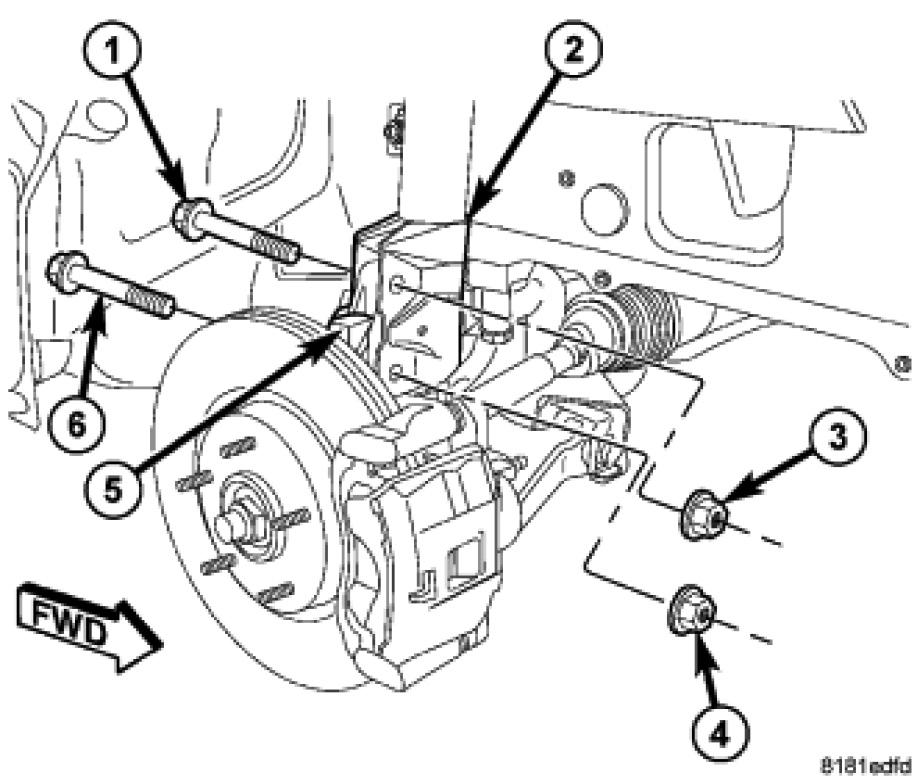 9. Remove the original nuts (3, 4) and upper (1) and lower (6) bolts attaching the strut clevis bracket (2) to the knuckle (5).