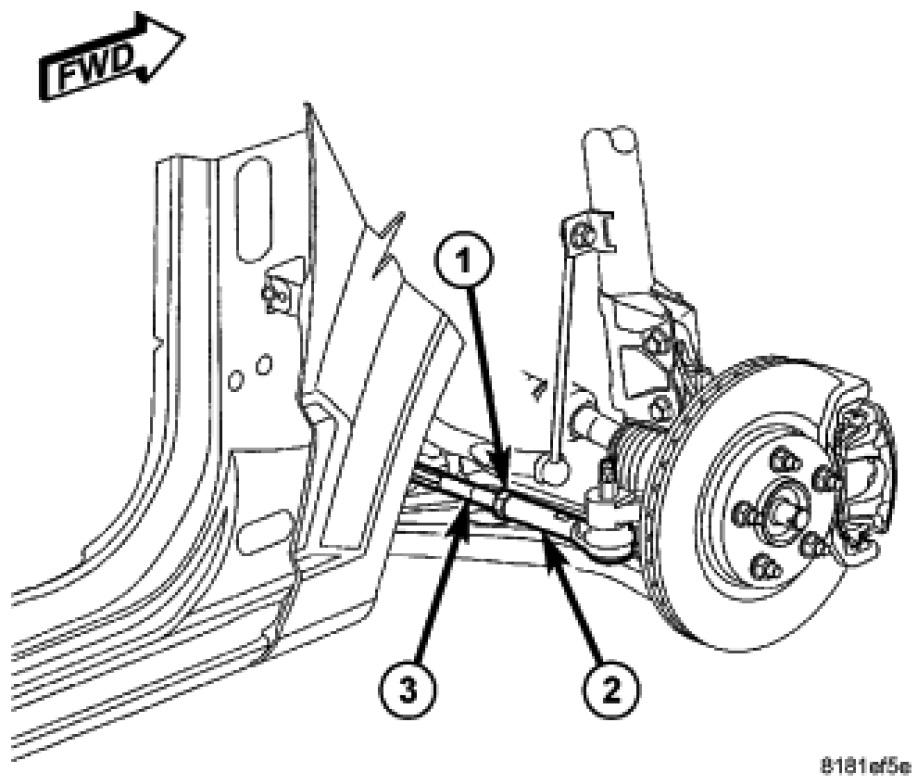 5. Loosen the tie rod adjusting jam nut (1). Grasp the inner tie rod (3) and rotate it one way or the other until the front wheel toe is set to the preferred specification. [1][2]Alignment