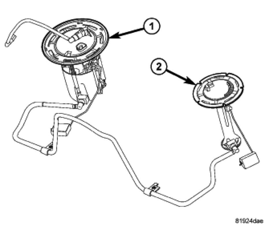 6. If equipped with AWD, disconnect fuel line between fuel pump module (1) and fuel level unit (2).