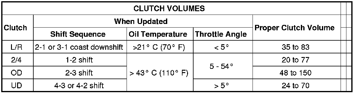 Certain mechanical problems within the clutch assemblies (broken return springs, out of position snap rings, excessive clutch pack clearance, improper assembly, etc.) can cause inadequate or out-of-range clutch volumes. Also, defective Input/Output Speed Sensors and wiring can cause these conditions. The following chart identifies the appropriate clutch volumes and when they are monitored/updated: