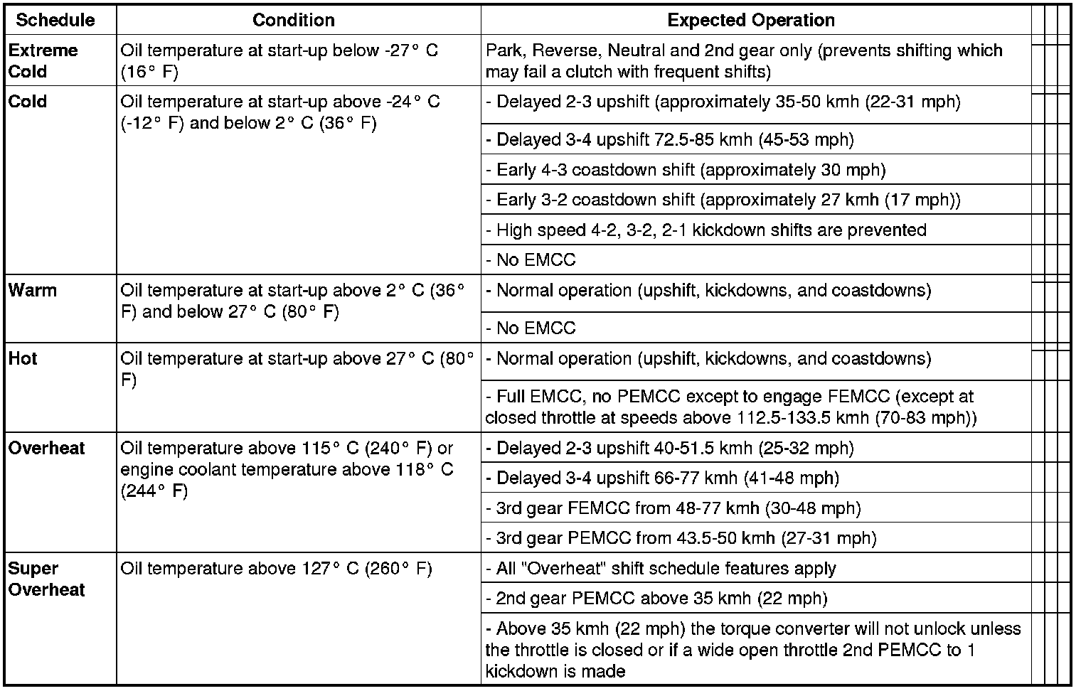 As driving conditions change, the PCM appropriately adjusts the shift schedule. Refer to the following chart to determine the appropriate operation expected, depending on driving conditions.