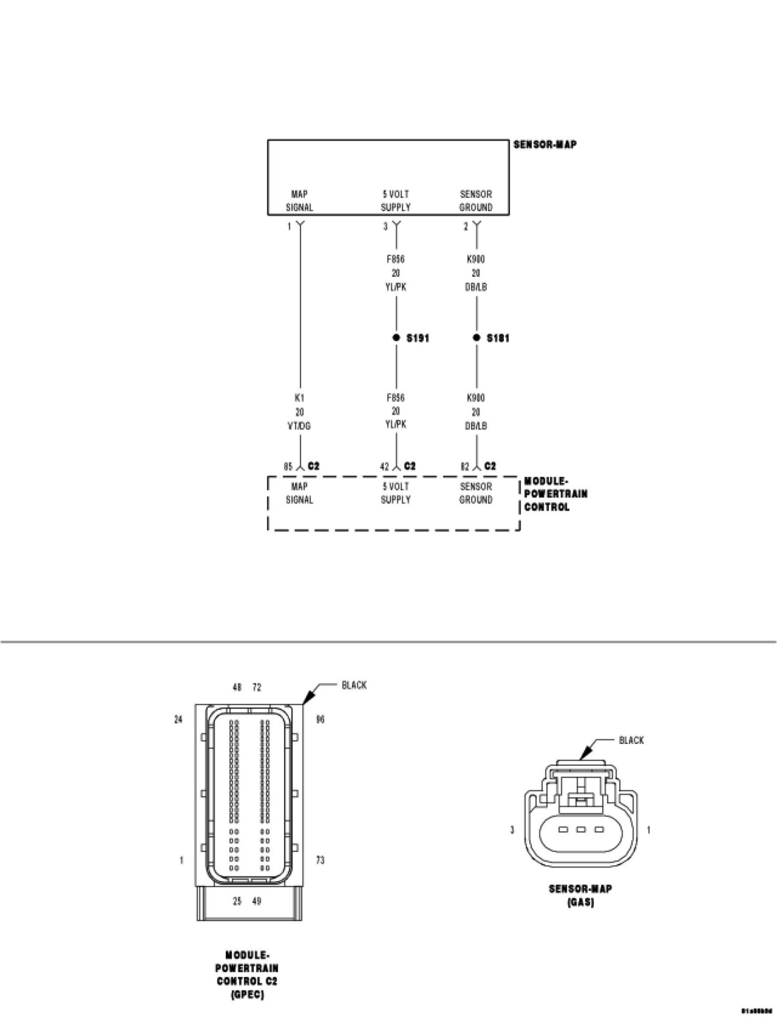Using the wiring diagram/schematic as a guide, inspect the wiring and connectors between the MAP Sensor and the PCM.