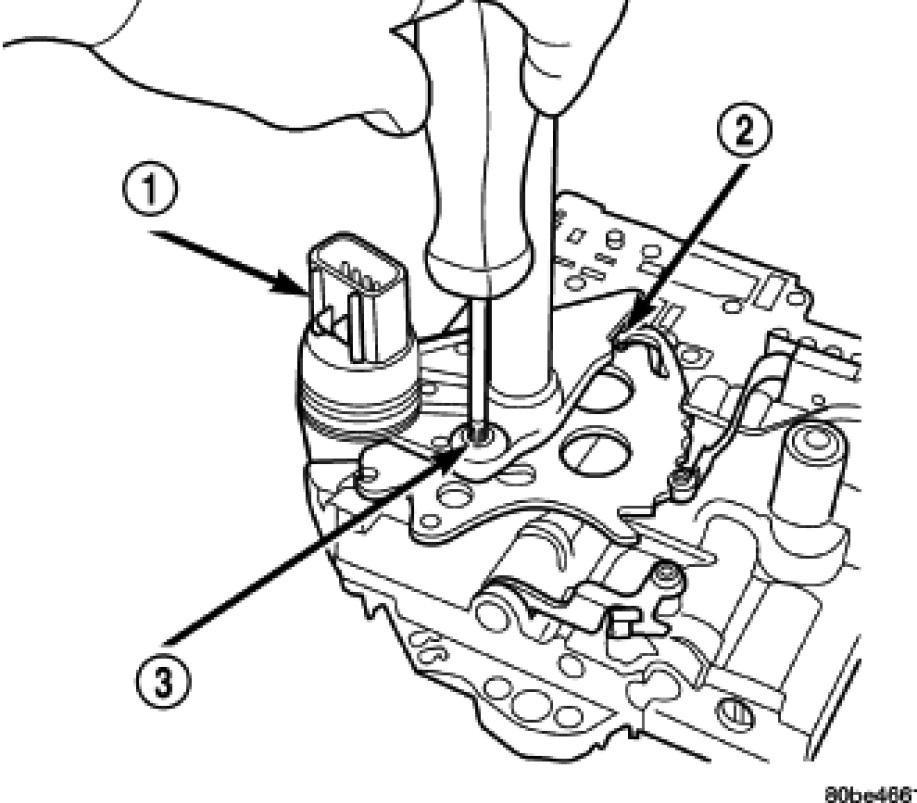 Install Transmission Range Sensor (TRS) (1) to the valve body and torque retaining screw (3) to 5 Nm (45 in. lbs.).