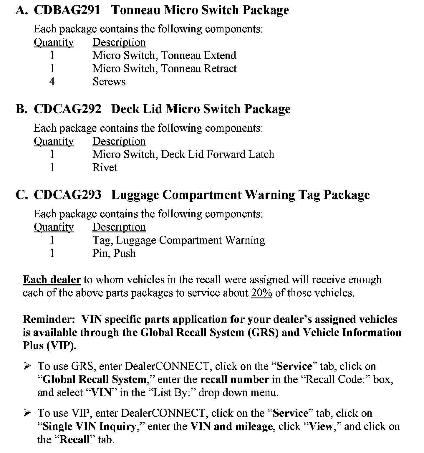 All involved vehicles have been entered into the DealerCONNECT Global Recall System (GRS) and Vehicle Information Plus (VIP) for dealer inquiry as needed.