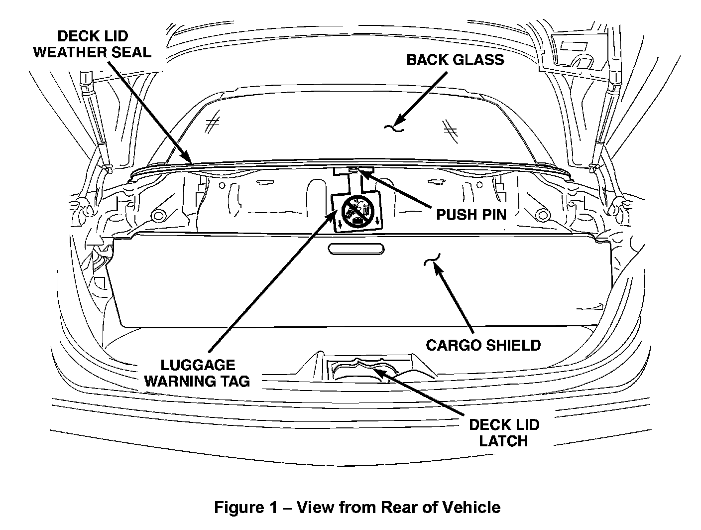 c. Using the supplied push pin, install the luggage compartment warning tag as shown in Figure 1.