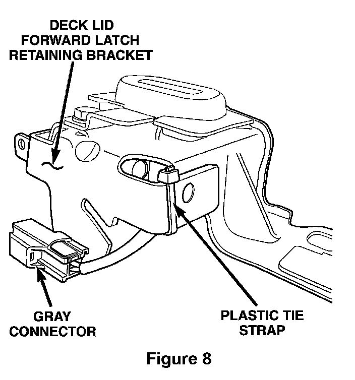 n. Secure the gray connector to the deck lid forward latch retaining bracket (Figure 8).