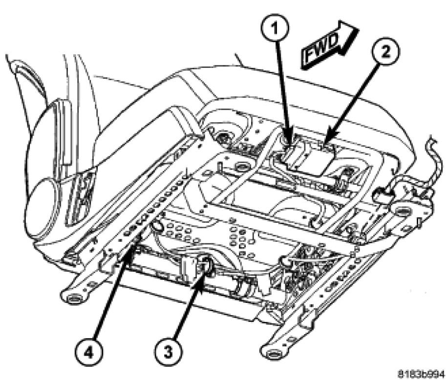 The heated seat module (2) is located under the driver front seat. It has a single electrical connector (1) and a push pin style retainer that secures it to the seat pan (4). The module can be accessed from under the Driver seat with the seat in the full back and up position.