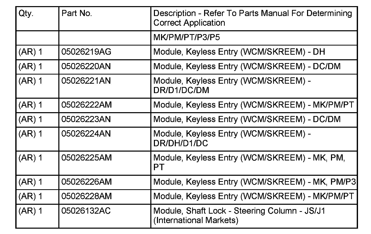 The part numbers listed in the following part reference table are to be used as A GUIDE to help determine if the WCM, that is currently in the vehicle, may require replacement. If it is determined that the WCM requires replacement, then ALWAYS REFER TO THE PARTS MANUAL to determine the correct WCM for the specific vehicle in question. In some earlier model years, the WCM may rule (supersede) to one of the part numbers listed in the table. ALWAYS REFER TO THE PARTS MANUAL (not the part reference table) to determine the correct part number ruling (supercedence / substitution). MAKE CERTAIN THAT THE CORRECT WCM IS ORDERED THE FIRST TIME FOR THE SPECIFIC VEHICLE IN QUESTION.