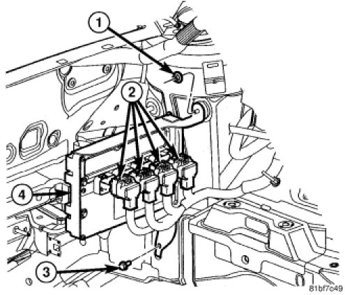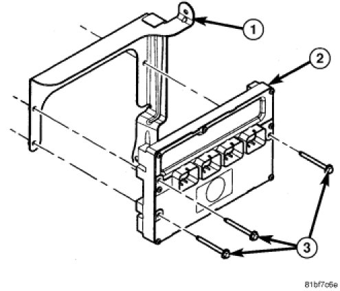 1. Install the Powertrain Control Module (PCM) (2) to bracket (1). Tighten bolts (3) to 5 Nm (45 in. lbs.).
