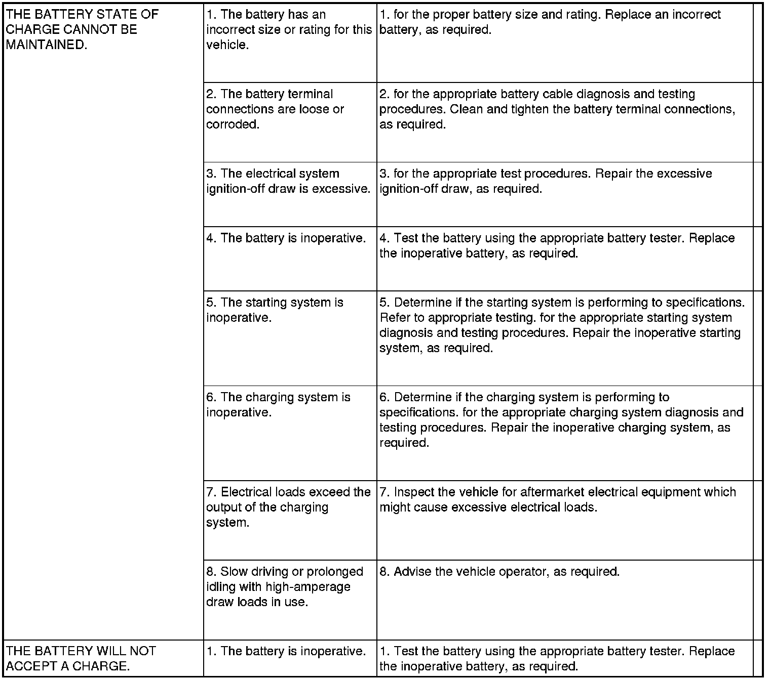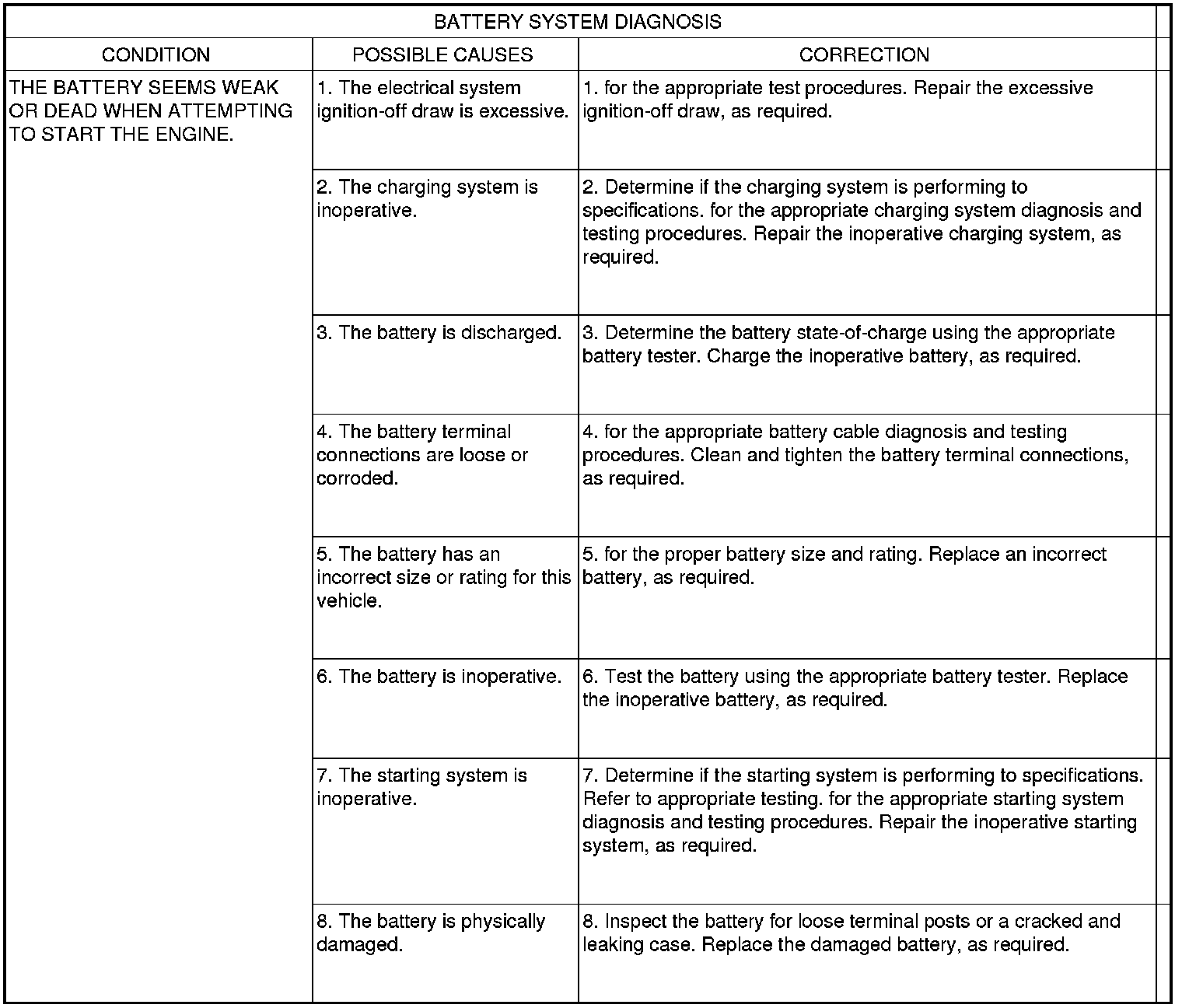 The battery, starting, and charging systems in the vehicle operate with one another and must be tested as a complete system. In order for the engine to start and the battery to maintain its charge properly, all of the components that are used in these systems must perform within specifications. It is important that the battery, starting, and charging systems be thoroughly tested and inspected any time a battery needs to be charged or replaced. The cause of abnormal battery discharge, overcharging or early battery failure must be diagnosed and corrected before a battery is replaced and before a vehicle is returned to service. However, when attempting to diagnose any of these systems, it is important that you keep their interdependency in mind.
