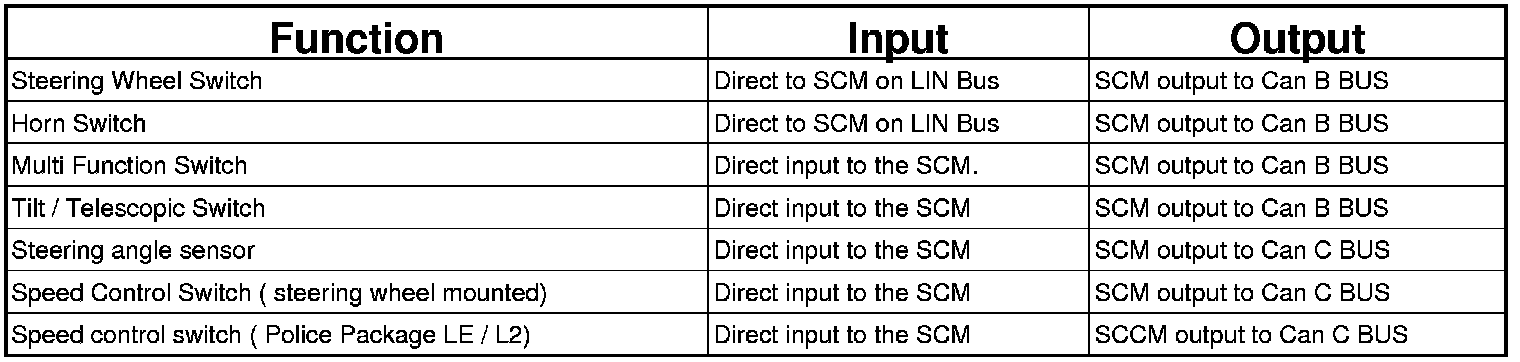 The Steering Control Module (SCM) communicates via the Local Interconnect Network (LIN) serial data bus to the steering wheel switches and the horn switch. The SCM communicates across the Can C and Can B. This is an ultra-low voltage serial data bus that allows the following components to communicate with the Controller Area Network (CAN) B and C data buses.