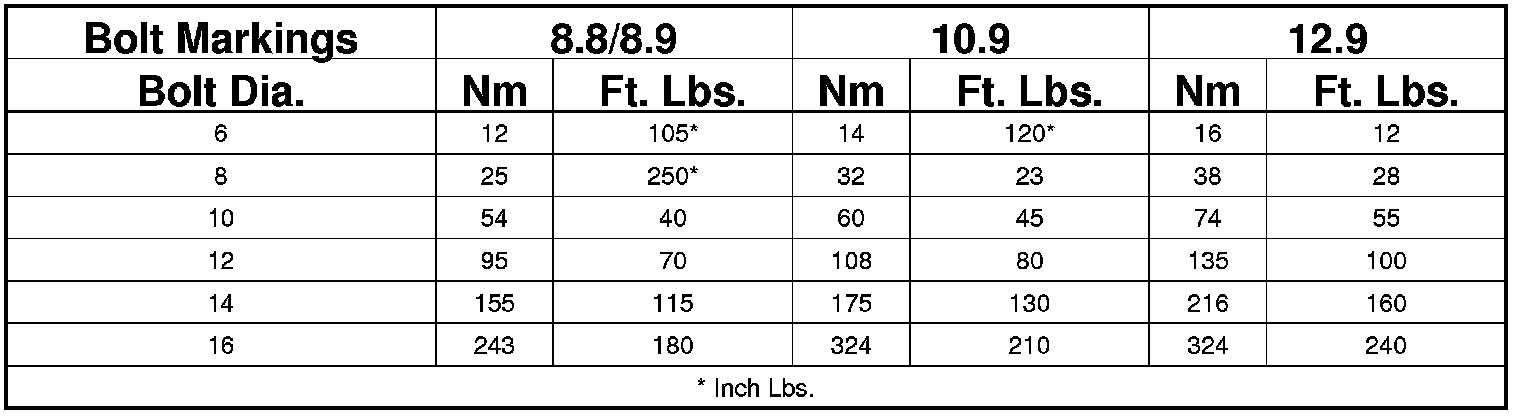 The SAE bolt strength grades range from grade 2 to grade 8. The higher the grade number, the greater the bolt strength. Identification is determined by the line marks on the top of each bolt head. The actual bolt strength grade corresponds to the number of line marks plus 2. The most commonly used metric bolt strength classes are 9.8 and 10.9. The metric strength class identification number is imprinted on the head of the bolt. The higher the class number, the greater the bolt strength. Some metric nuts are imprinted with a single-digit strength class on the nut face. Refer to the Fastener Identification and Fastener Strength Charts.
