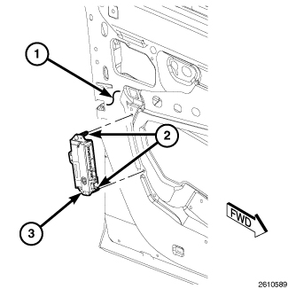 1. Position the door control module (3) to the inner door panel (1).