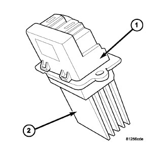 The blower motor power module is mounted to the rear of the HVAC housing, directly behind the glove box. The blower motor power module consists of a molded plastic mounting plate with two integral connector receptacles (1). Concealed behind the mounting plate is the power module electronic circuitry and a large finned heat sink (2).