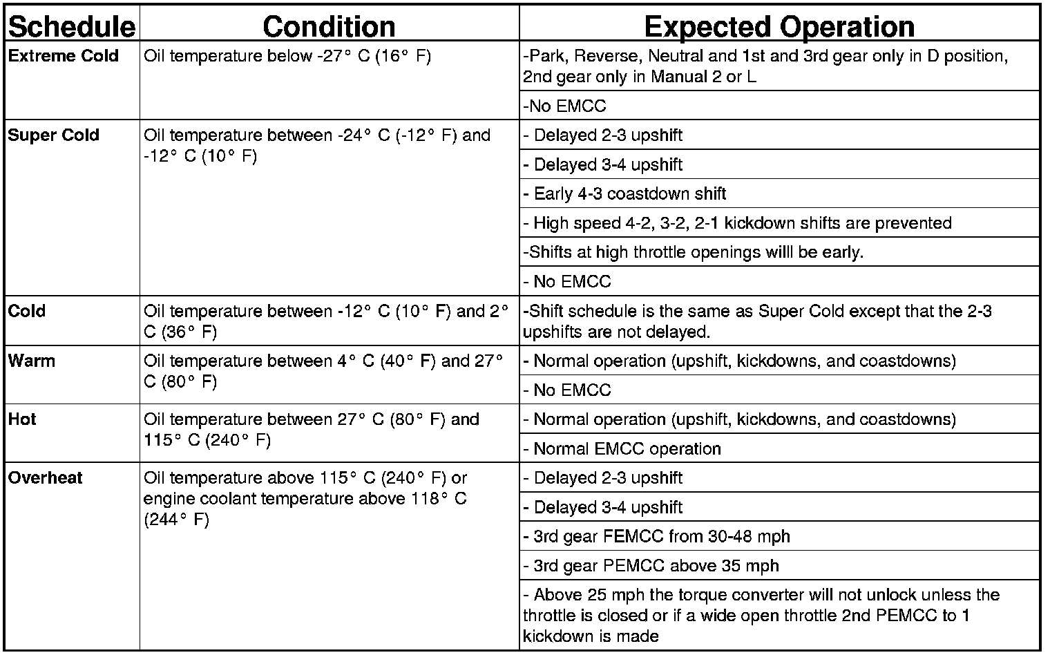 As driving conditions change, the TCM appropriately adjusts the shift schedule. Refer to the following chart to determine the appropriate operation expected, depending on driving conditions.