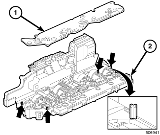 10. Remove the TEHCM side mounting bolts (1) and main mounting bolts (2) from the valve body.