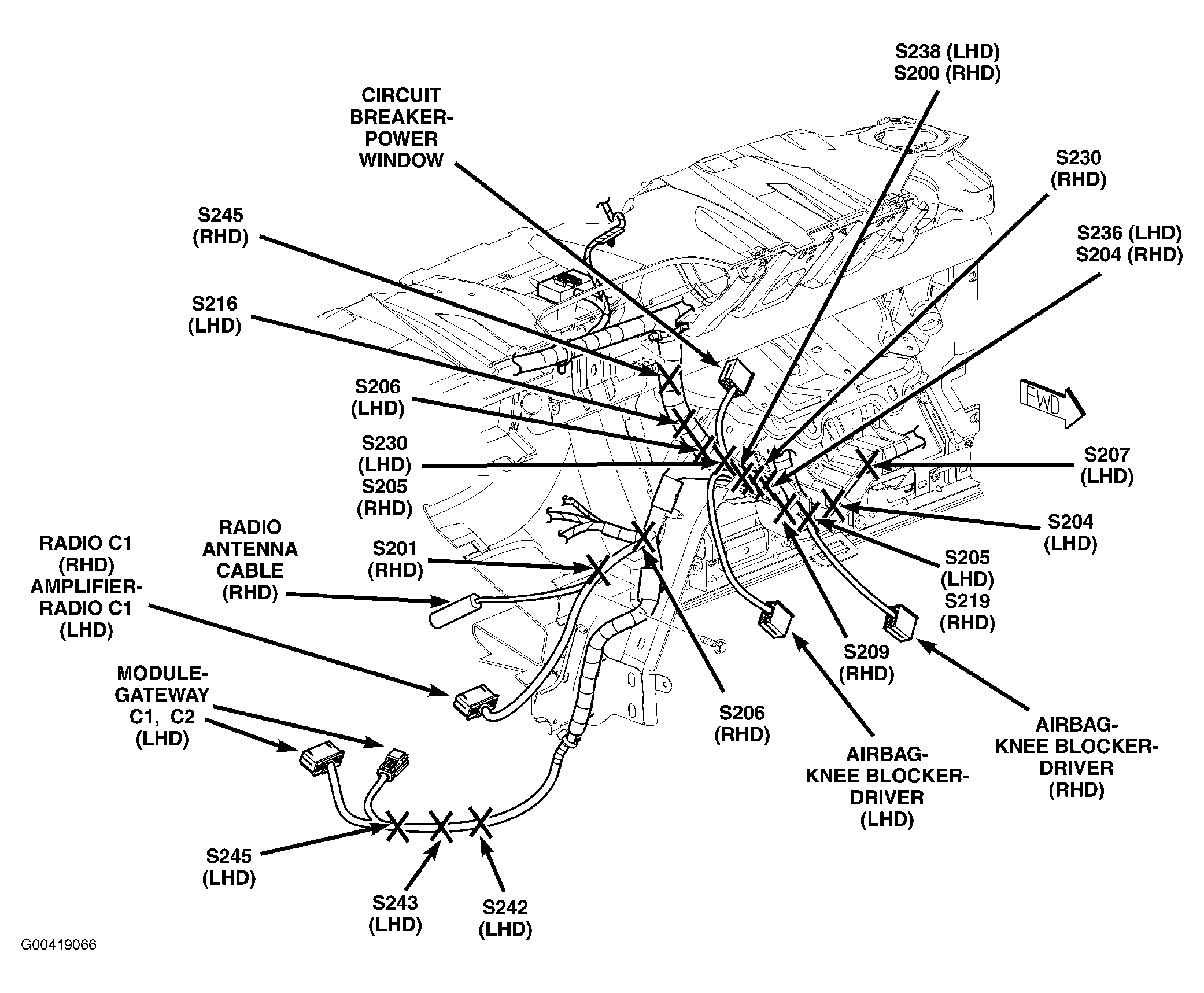 | Power Window Circuit Breaker | Left side of dash. See Figure. |
