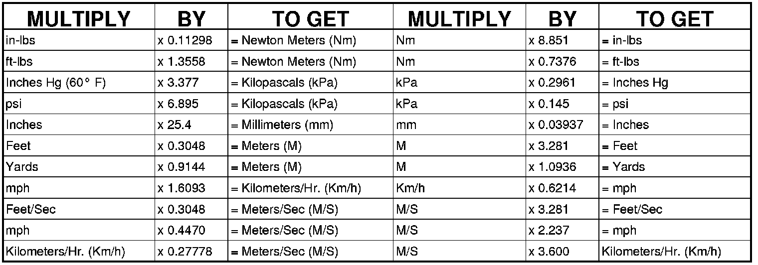 Refer to the Metric Conversion Chart to convert torque values listed in metric Newton Meters (Nm). Also, use the chart to convert between millimeters (mm) and inches (in.).