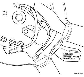 The speed control switch is mounted in the steering wheel and wired through the clock spring device under the airbag module.