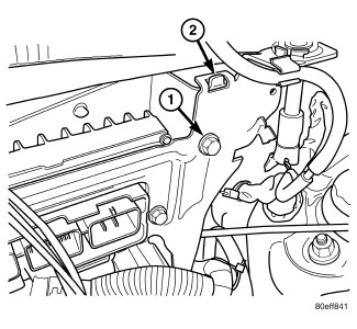 3. Locate the PCM and bracket assembly bracket on the tab (2).