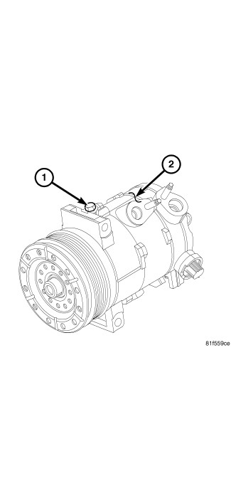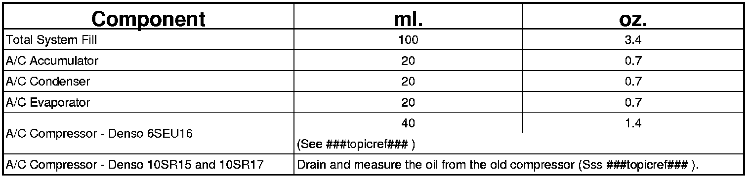 NOTE: When replacing multiple A/C system components, see to the Refrigerant Oil Capacities chart to determine how much oil should be removed from the new A/C compressor (example: new 6SEU16 compressor and accumulator requires 60 ml. (2.1 oz.) of oil to be added to the system. 100 ml. (3.4 oz.) of oil is in new compressor. 100 ml. (3.4 oz.) minus 60 ml. (2.1 oz.) equals 40 ml. (1.4 oz.) oil to be drained from new compressor).