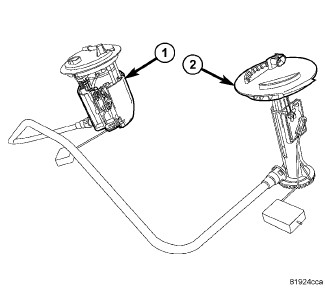 The main fuel pump module (1) contains the fuel pump, fuel reservoir, level sensor, fuel pressure regulator, and fuel filter. The secondary fuel level sensor (2) contains only a fuel level sensor.