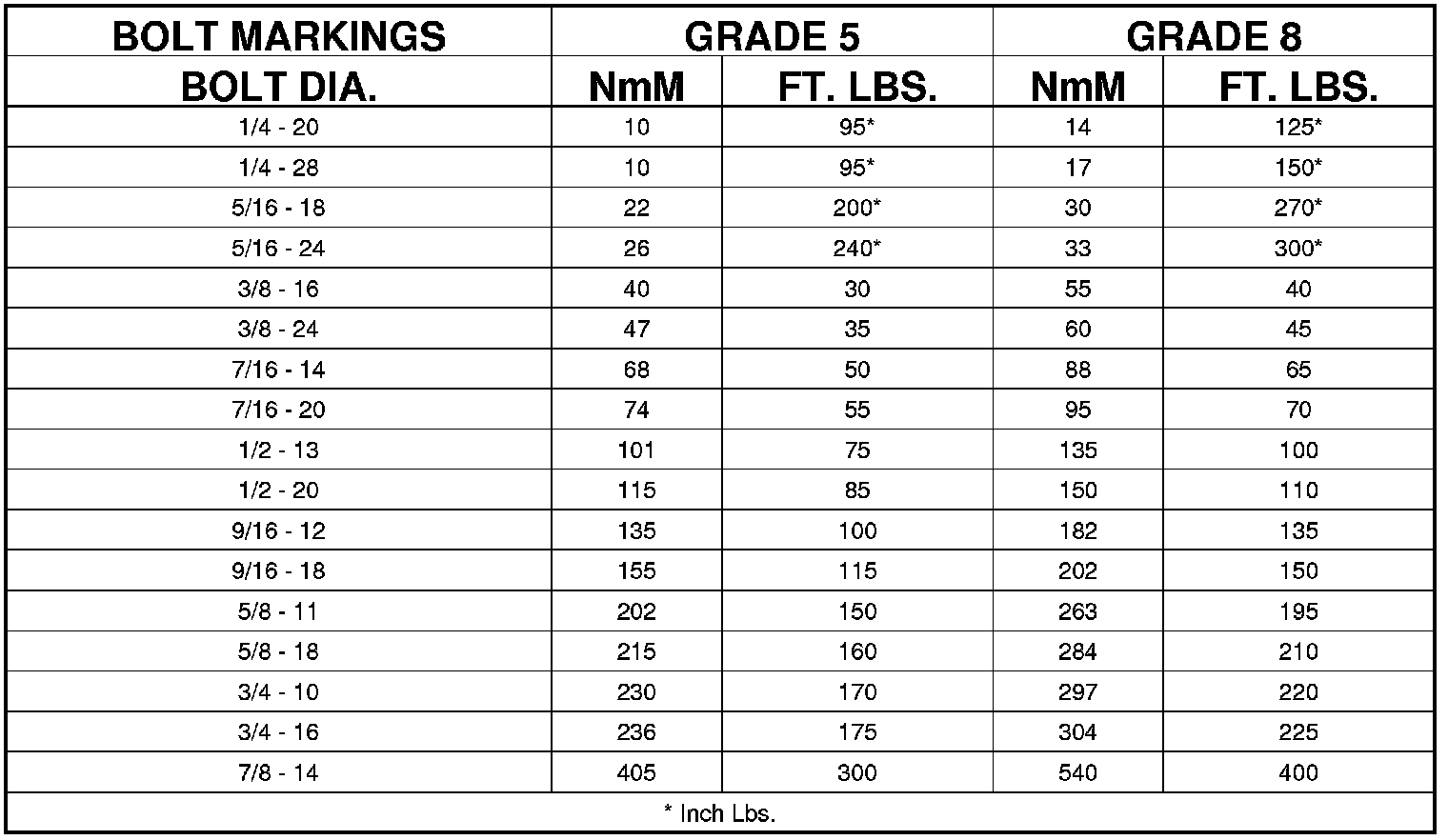 BOLT MARKINGS AND TORQUES - U. S. CUSTOMARY
