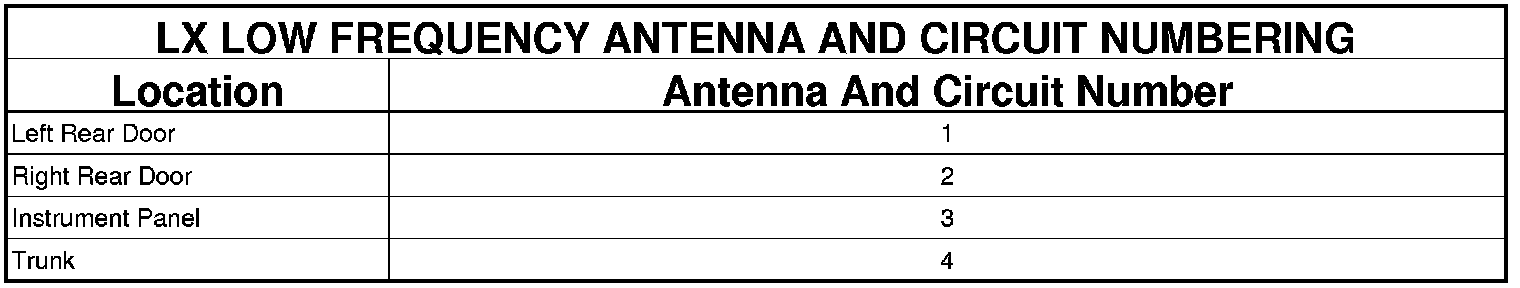 The number of antennas and the specific antenna locations are designed to ensure complete vehicle interior coverage. The LF antennas are each numbered and connected to the PEM on dedicated and sequentially numbered circuits. This arrangement allows the PEM to localize the positions of transmitting FOBIK units using a triangulation strategy. See the LX Low Frequency Antenna And Circuit Numbering table.